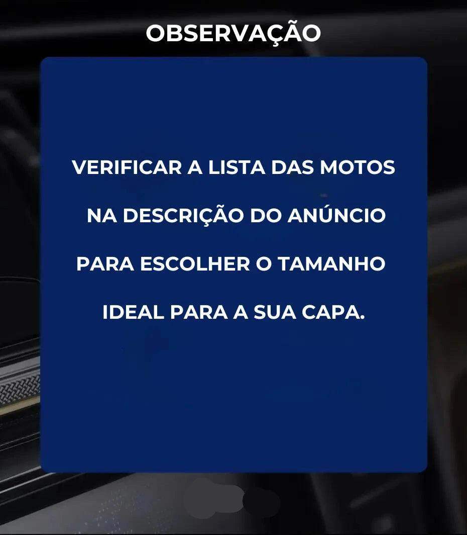 Observação Importante 1: Este modelo de capa não é compatível com motos Big Trail ou Custom que tenham baú instalado.